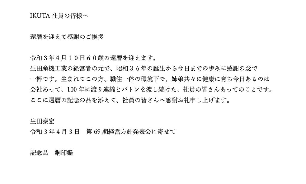 以下に新入社員歓迎の言葉と経営方針発表会の社長方針を記します。