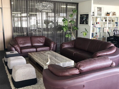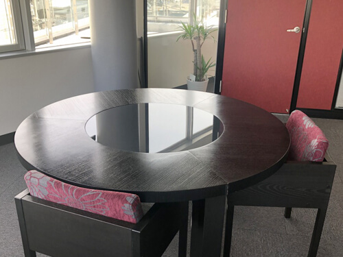当時私たちが買い付けたのが、いまも社内で使われている床や壁のタイルをはじめ、社長室の応接セット、事務所や会議室の机、イスなど。ごとうさんの素晴らしいセンスと納得できるコスト、そして生田社長の願いと想いをかなえるための委員会メンバーの様々な働きが見事にコラボした逸品の数々といえるだろう。