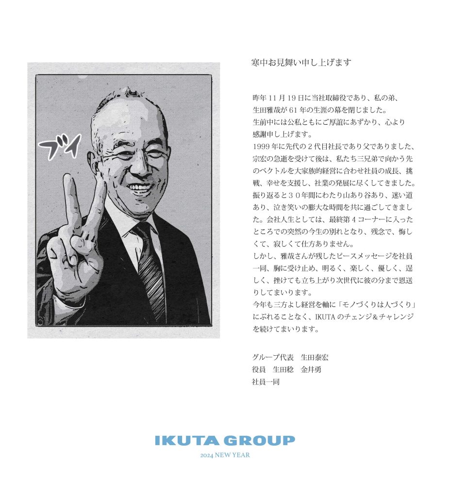 昨年 11 月 19 日に当社取締役であり、私の弟、生田雅哉が 61 年の生涯の幕を閉じました。